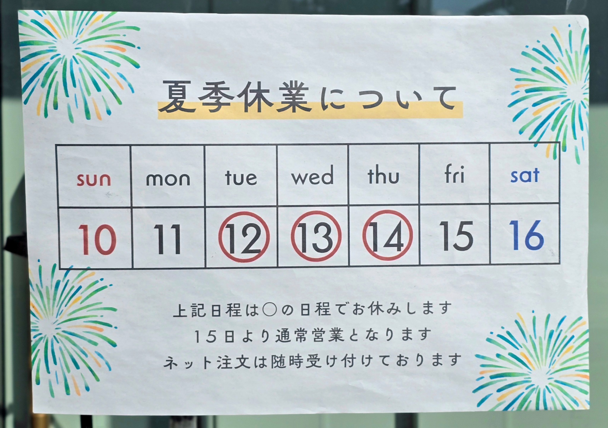 8/12(火)・8/13(水)・8/14(木)は夏季休業日。