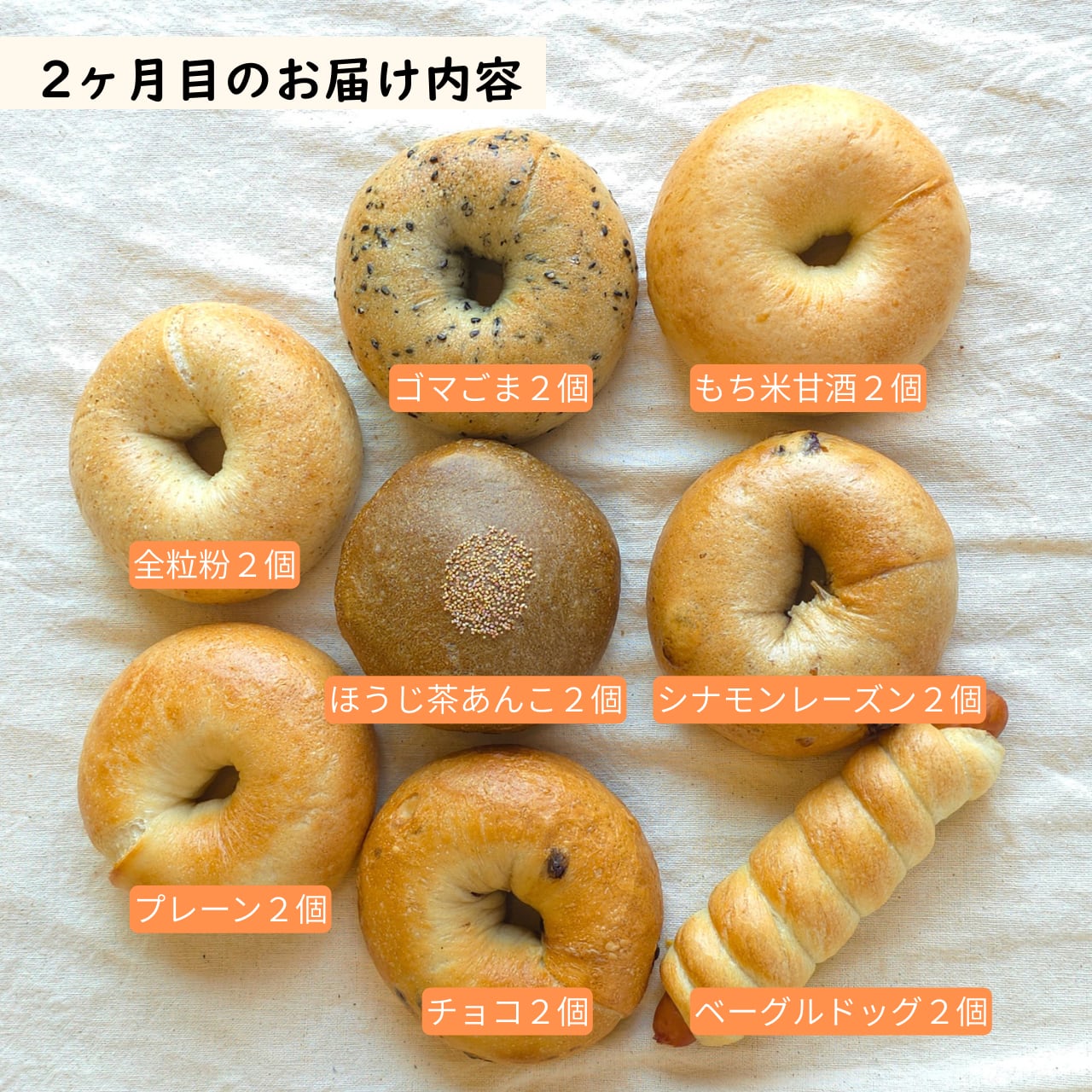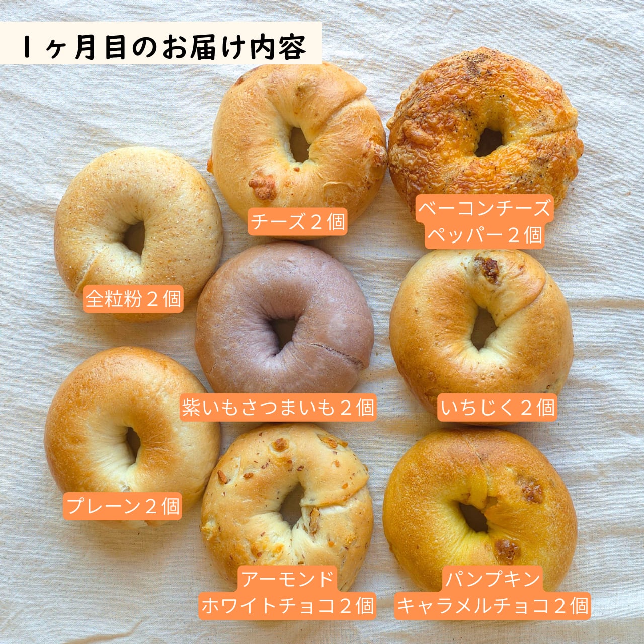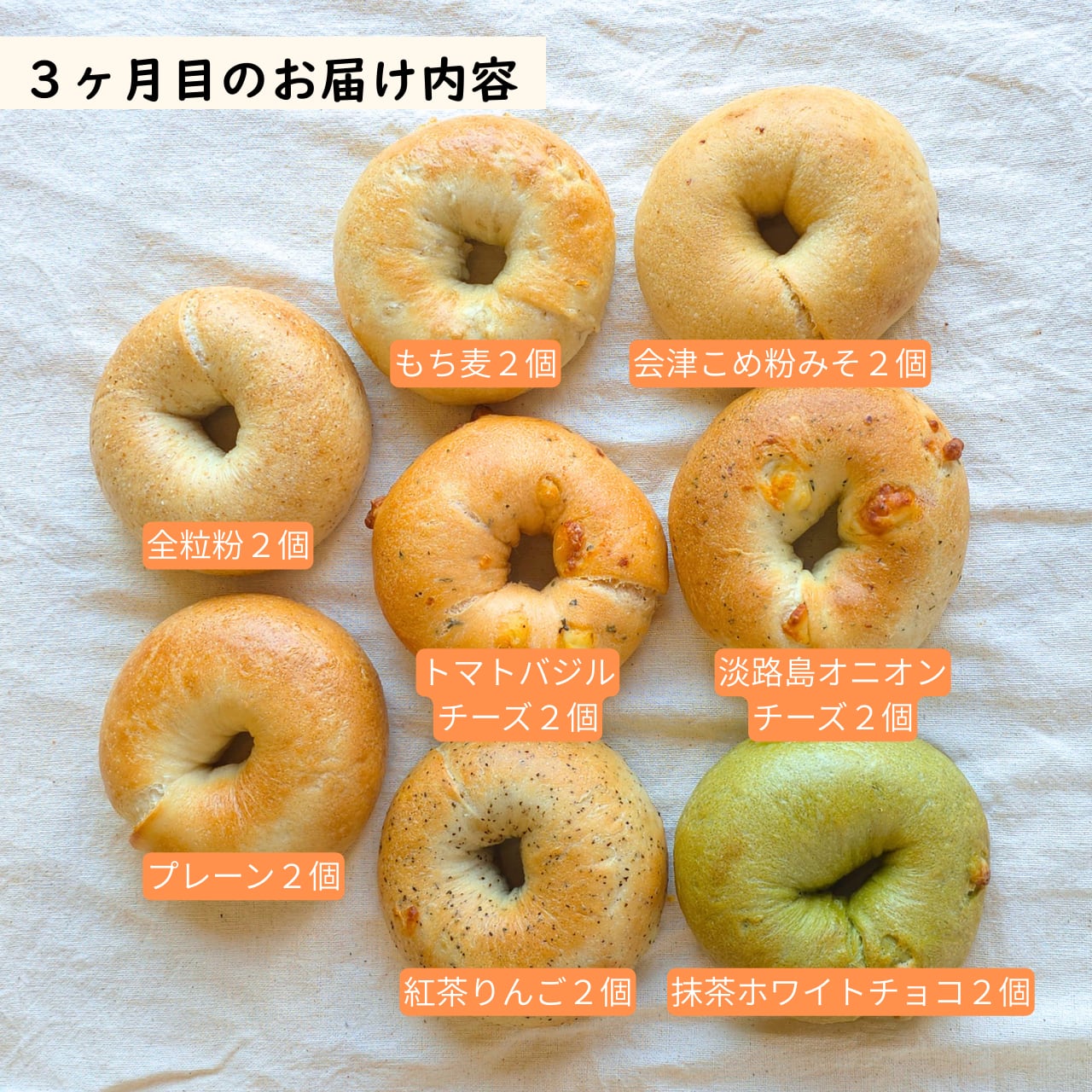 會ベーグル自慢のプレーン&全粒粉と共に、毎月色んな味を詰め合わせてお届けします!